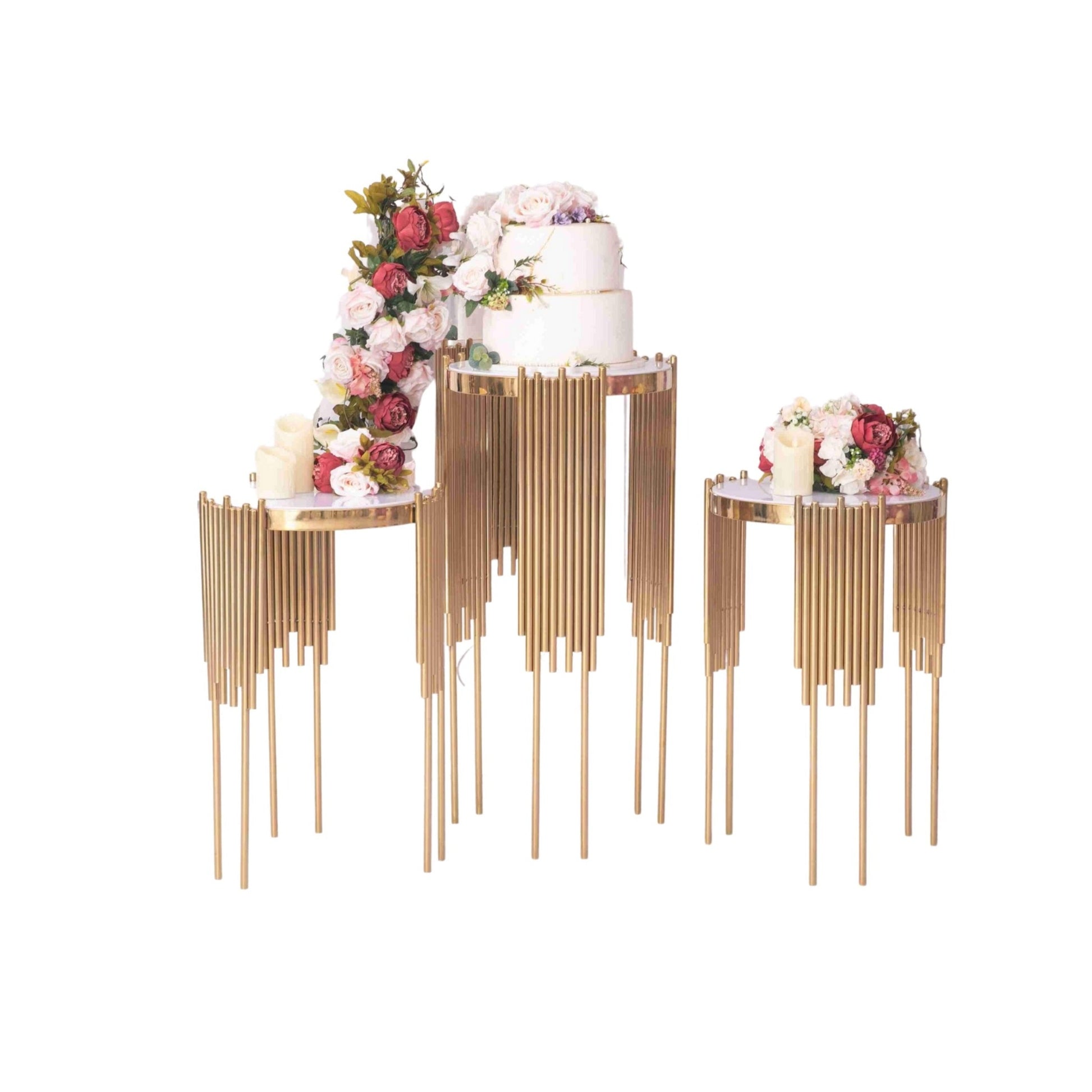 Alice Pedestals are highly trending pieces of decoration for any event because of their elegant and luxurious look and feel. This set of three classy gold round stands with snow-white tops is perfect for cake or food displays.