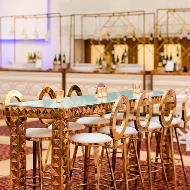 Asteria Bar Table is a stunning gold bar table with a mirror glass top. This can accommodate up to 8 bar stools and is a great choice for a glamorous setup