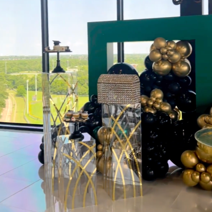 Clear Pedestals provide an elegant and luxurious look and feel to any event. This set of three clear classy pedestals with gold decoration is perfect for cake or food displays.
