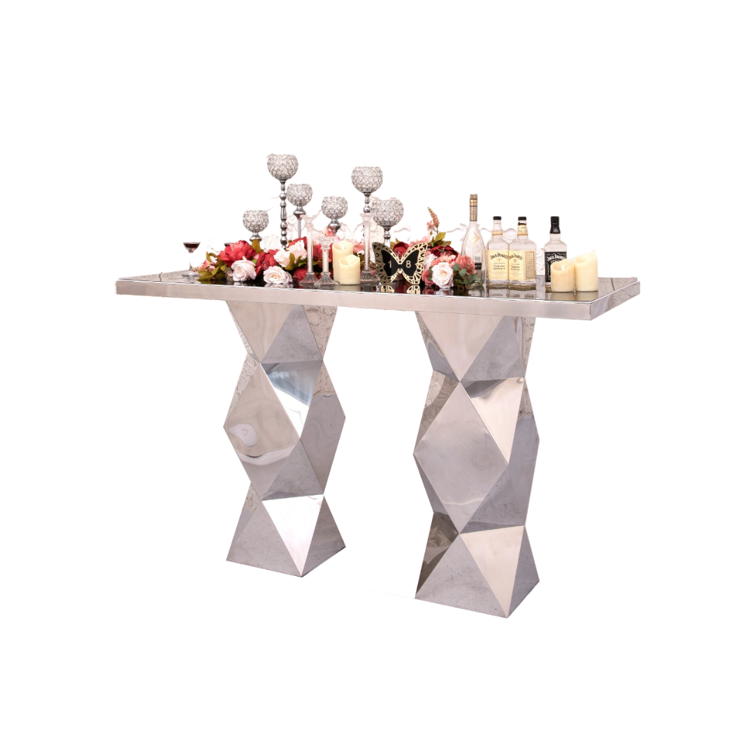 Radiant Bar Table (Silver) is a stunning bar table with diamond-inspired legs. This table has a mirror glass top and is a great bar table for a glamorous setup.