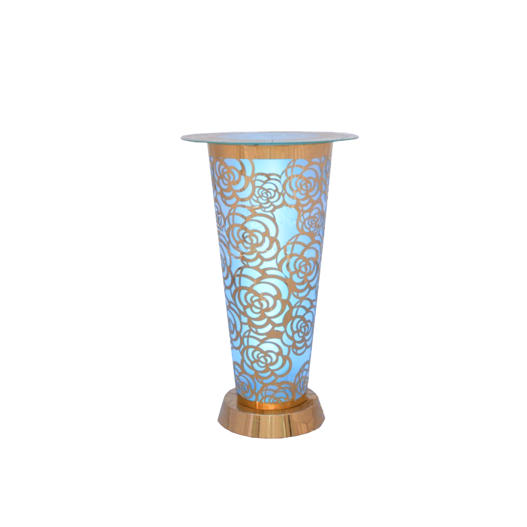 This gold Roses Bar Table with a round glass top is a great addition to your cocktail party setup. Match it perfectly with any bar stool for your event.