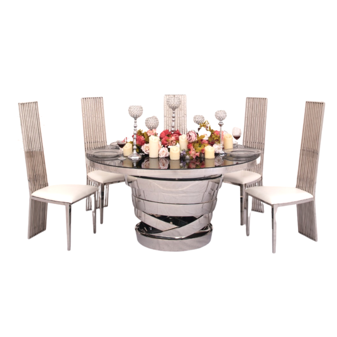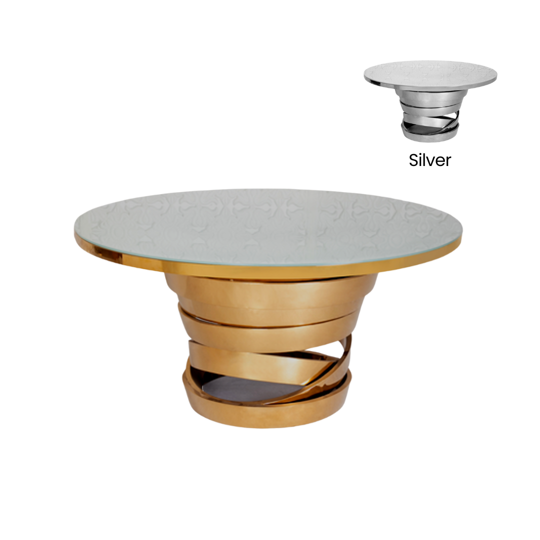 Whirl Round Table is an elegant dining table with a unique whirl design. Avalable in Gold & Silver color, this is the best table for your VIP guests.